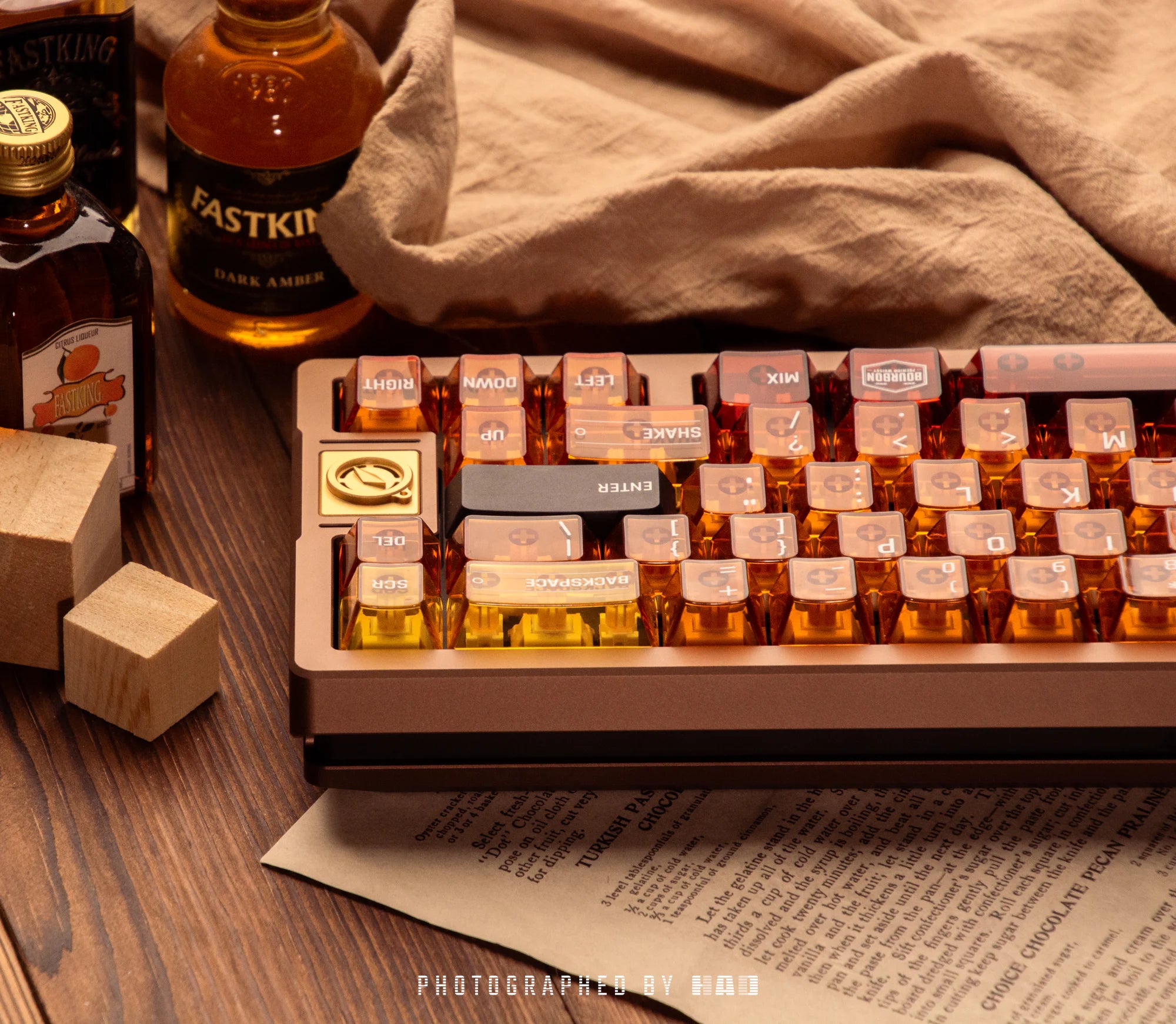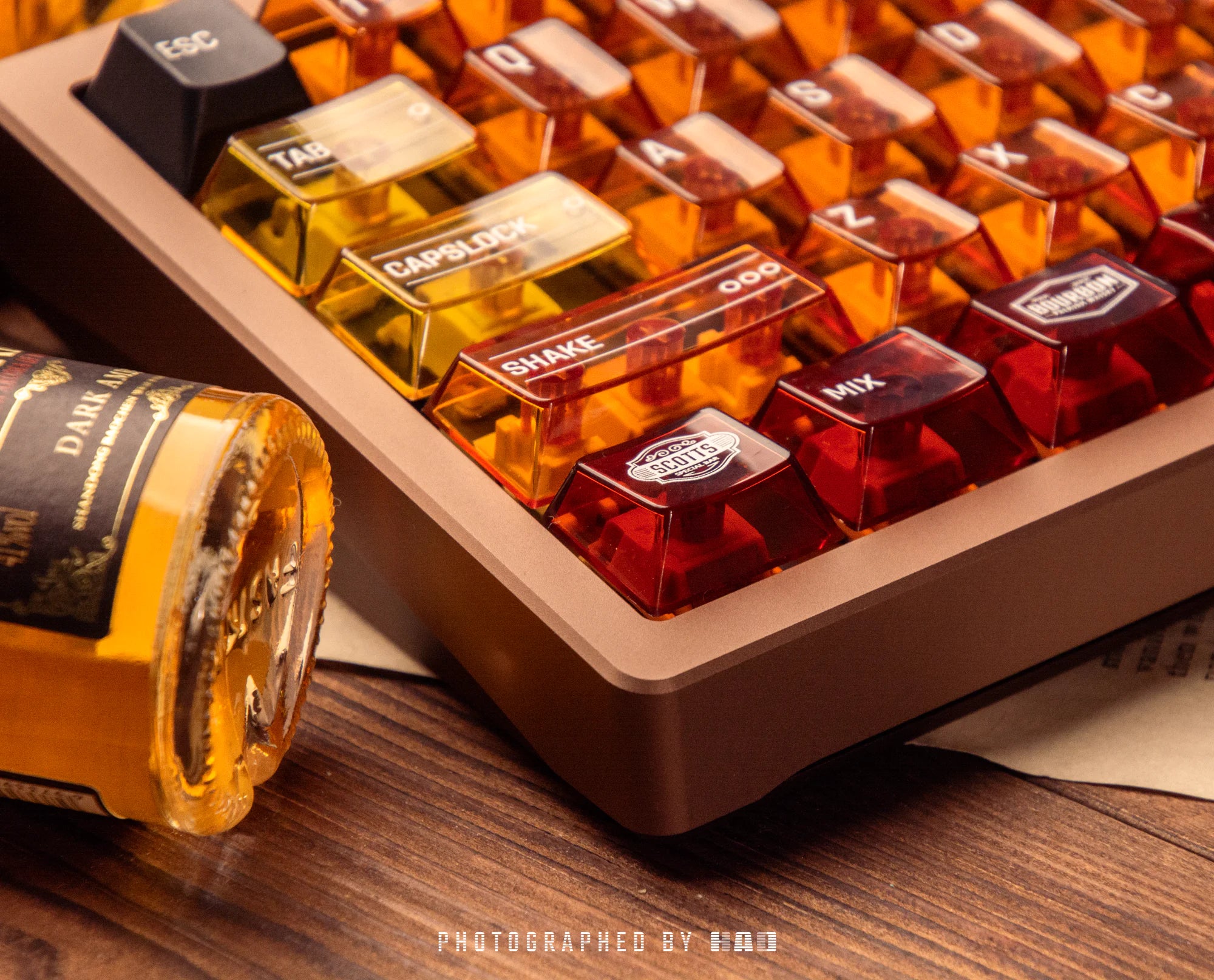 Inspired by the art of cocktail mixing, these keycaps blend unique flavors of experience. The set features a mix of transparent and solid colors, drawing inspiration from the rich hues of whiskey, the decor of a cozy bar, and the botanicals used in cocktails.
